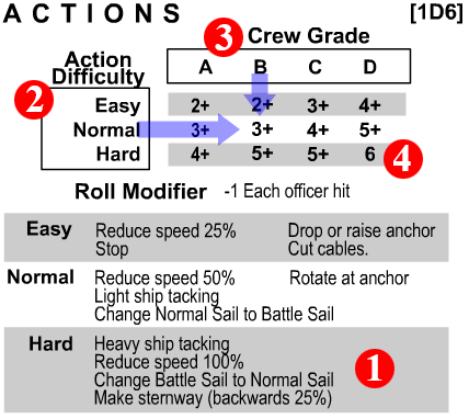 Start by locating the Easy, Normal or Hard action to be carried out from the list that makes up the bottom half of the table (number 1). Expected actions that all crews are presumed able to do such as wearing are not listed and do not need die rolls to be carried out. Once the player has identified the action and its difficulty level, go to the Action Difficulty column (number 2) and cross reference that line with the corresponding Crew Grade (number 3) that matches the crew grade of the ship. The cross reference point in the result field (number 4) will be the number on 1D6 that the has to roll equal to or higher in order to carry out that action. Subtract one point from the die roll for each Officer Hit the ship has suffered.