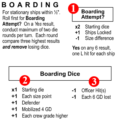 to find out if a boarding attempt has been able to happen. Start with two dice, and add one more if the ships are fouled (locked together) and subtract one die if the ships are of different sizes. Roll the dice, and if there are any 6 results, a boarding action happens and players proceed to the Boarding Dice section.