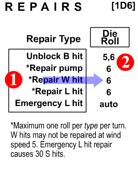 Start by locating the type of repair to be attempted (number 1). Roll 1D6 and consult the number listed under Die Roll that corresponds to the repair type (number 2). In order for that critical hit to be repaired the die roll must match the numbers listed . Repaired hits are crossed-out of the ship log.