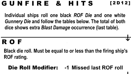 The result of the black ROF die will decide whether the ship fired this turn. If the modified number rolled is equal to or less than the firing ship's current ROF value, the ship is considered to have fired this turn and the Battery Fire results can be checked for effect (or lack thereof). If the modified ROF number is greater than the current ROF rating for that ship, it has failed to "put enough lead in the air" that turn and is considered not to have fired. This does not mean the ship did not fire at all, just that it did not fire enough to warrant calculating. There is one modifier that may apply to the die roll, and this can improve the chance for a ship to succeed on the ROF die portion of the next roll attempt.