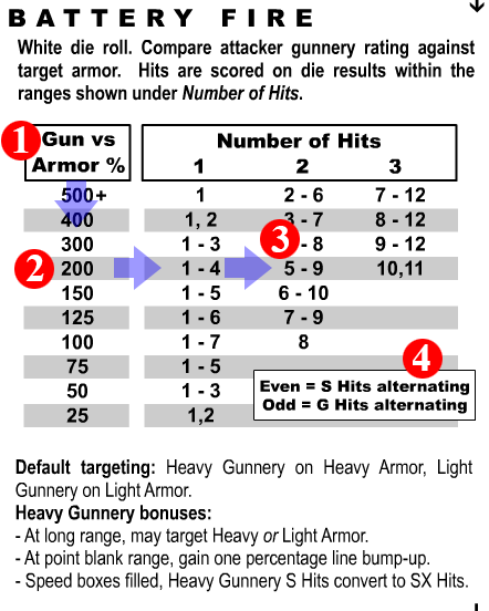 Scoring Hits: Once you know your percent difference, refer to your white gunnery die roll. If the total falls within any of the matching Die Roll numbers shown in the middle field (number three), apply the number of hits shown at the top of the matching column, which will be one, two or three hits.
