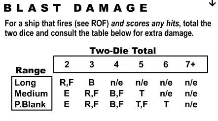 Start by totaling both dice rolled for the ROF and Battery Fire tables (do not re-roll, use the original die roll that decided the gunnery hits, if any). Take that value and cross reference it with the Range line that matches the current distance between ships. The result Hit Code(s) are applied to the ship as of the end of the current gunnery phase (keeping in mind that all gunnery within a phase is considered simultaneous). Blast damage can only happen if the ship actually fired and also scored hits on the Battery Fire Table.
