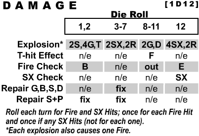 Explosion: For any E result, roll 2D6 on this line and apply the result codes shown. Note that some explosion results cause repairable S Hits, and others cause unrepairable SX Hits. Each explosion also causes one additional F Hit (fire).
