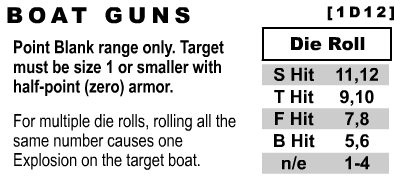 Boat Gun Fire Any ships with boat gun points may use them to fire at light vessels that approach to within point-blank range. Light vessels count as anything Size 1 or smaller, with less than one point of armor rating (i.e., 1/2 point or Zero armor). To fire boat guns, simply roll 1D12 per current boat gun point that is available to the vessel (not including points marked out due to damage). Boat gun points may be used once per turn (one gunnery phase only, not both) in any direction and they may be split among several targets. If firing two or more boat gun dice onto one target, if all dice roll the same number (doubles, triples, etc.) then the target boat also suffers an explosion, even if the die roll results themselves caused no effects.