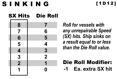 Sinking Table Ships which have two or more SX hits must roll on the Sinking table at the end of each turn to see if they sink. Refer to the SX Hits column and cross reference the number of current hits to the Die Roll number next to it. If the ship rolls equal to or less than the number shown, it sinks and is removed from the playing area. If the ship has suffered additional SX hits (beyond the eight which blocked out its existing speed boxes), subtract one point from the die roll for each extra SX hit showing (extra hits should be recorded in the ship log margin).