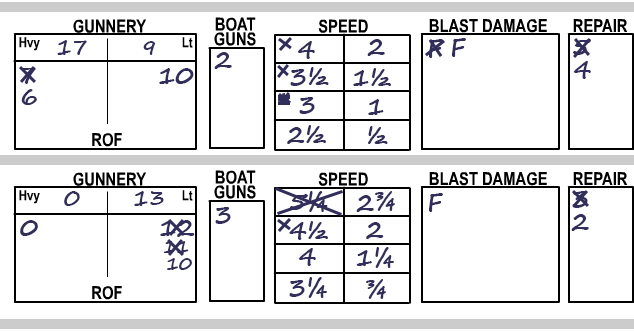 Unrepairable speed hits (SX Hits) are applied in the same manner as regular S Hits, but they are - as the title states - not repairable and are shown by completely crossing out affected boxes. If the ship already has repairable speed hits, migrate those downward to make room for the permanently crossed out boxes which should be placed in sequence starting at the top-left of the ship's speed table. If the ship's speed boxes are full of SX Hits and it suffers more (and has not sunk yet), mark the extras in the margins around the speed box, those extra SX hits act as a die roll modifier toward making the ship sink.