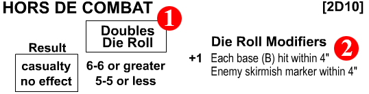 less than that needed to score a 1M hit is considered to be no effect on the enemy target. Any modified score that matches the 1 or 2 "Flee" result causes the skirmish marker to be picked up (it is considered to have fled back to its parent brigade). Note