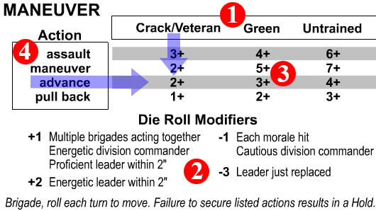This table is used to control whether a brigade can conduct a particular type move or maneuver. Start with the column that matches the unit's troop grade (number 1) and roll 1D10, applying any corresponding die roll modifiers (number 2).